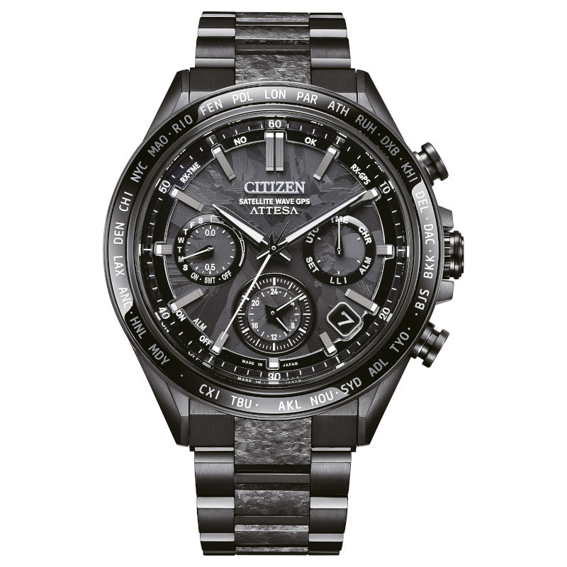 Japoński sportowy zegarek męski Citizen Attesa Satellite Wave GPS Hakuto-R Limited Edition CC4067-66E. Model z mechanizmem solarnym F950 z łącznością satelitarną GPS. Koperta została wykonana z antyalergicznego tytanu. Na bezelu umieszczono skróty nazw państw. Bransoleta została wykonana z rekrystalizowanego tytanu co nadaje jej głęboką barwę. Czarną tarczę chroni najtwardsze, odporne na zarysowania szkło szafirowe z powłoką antyrefleksyjną. Średnica koperty wynosi 45mm natomiast grubość 16mm. Klasa wodoszczelności tego modelu wynosi 10ATM. model pochodzi z edycji limitowanej do 2300 sztuk.