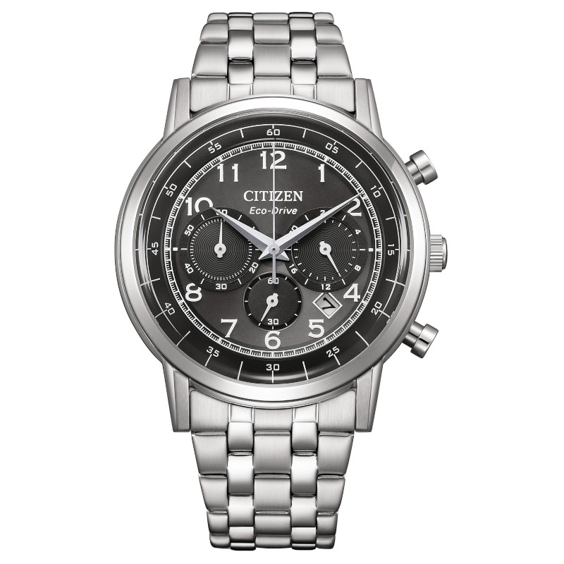 Sportowy zegarek męski Citizen Eco-Drive Classic Chrono CA4630-53E. Model z mechanizmem Eco-Drive z komplikacją chronografu oraz datownikiem. Koperta została wykonana ze stali szlachetnej. Bransoleta została wykonana ze stali szlachetnej. Grafitową tarczę chroni szkło mineralne. Średnica koperty wynosi 42mm natomiast grubość 14mm. Klasa wodoszczelności tego modelu wynosi 5ATM.