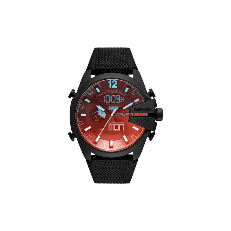 Modowy zegarek męski DIESEL Mega Chief DZ4548. Model z precyzyjnym mechanizmem kwarcowym. Koperta została wykonana ze stali szlachetnej pokrytej powłoką w kolorze czarnym. Czarny pasek został wykonany z tworzywa sztucznego. Tarczę z wyświetlaczem chroni szkło mineralne pokryte specjalną powłoką odbijająca światło dając czerwone refleksy. Średnica koperty wynosi 51mm natomiast grubość 14mm. Klasa wodoszczelności wynosi 10ATM.