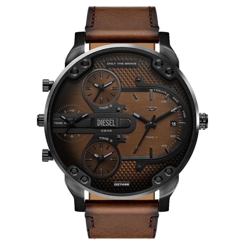 Modowy zegarek męski Diesel Mr. Daddy Slim DZ7492. Model z mechanizmem kwarcowym. Koperta została wykonana ze stali szlachetnej pokrytej powłoką w kolorze czarnym. Brązowy pasek został uszyty ze skóry naturalnej. Brązową tarczę chroni szkło mineralne. Średnica koperty wynosi 54mm natomiast grubość 9mm. Klasa wodoszczelności tego modelu wynosi 3ATM.