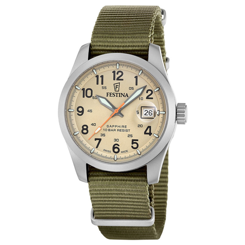 Sportowy zegarek męski Festina Swiss Made F20082/1. Model z precyzyjnym mechanizmem kwarcowym z komplikacją datownika. Koperta została wykonana ze stali szlachetnej. Oliwkowy pasek typu NATO został uszyty z włókien syntetycznych. Beżową tarczę chroni najtwardsze, odporne na zarysowania szkło szafirowe. Średnica koperty wynosi 39mm. Klasa wodoszczelności tego modelu wynosi 10ATM.