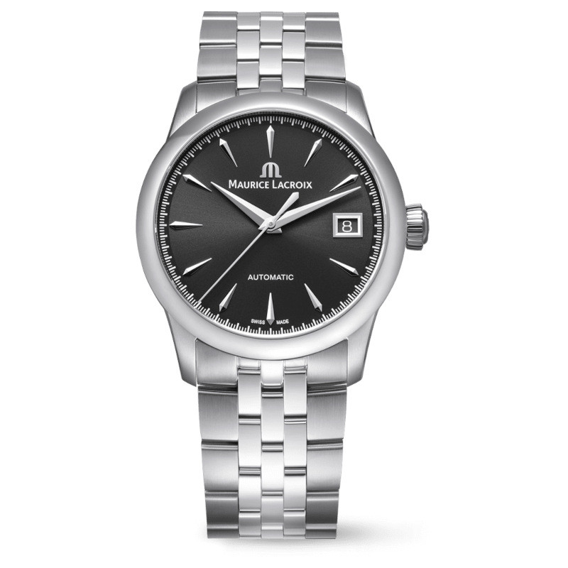 Szwajcarski elegancki zegarek męski Maurice Lacroix 1975 756007-SS002-330-1. Model z precyzyjnym szwajcarskim mechanizmem automatycznym ML115 z 38 godzinną rezerwą chodu oraz komplikacją datownika. Koperta została wykonana ze stali szlachetnej. Bransoleta została wykonana ze stali szlachetnej. Czarną tarczę chroni najtwardsze, odporne na zarysowania szkło szafirowe. Średnica koperty wynosi 36mm. Klasa wodoszczelności tego modelu wynosi 10ATM.