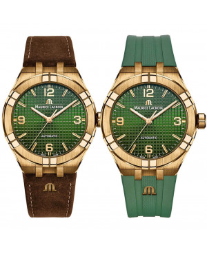 Szwajcarski sportowy zegarek męski MAURICE LACROIX Aikon Automatic AI6007-SS000-630-5 (AI6007SS0006305). Model z mechanizmem automatycznym ML115 oraz 38 godzinną rezerwą chodu. Rotor wykończony jest metodą Côtes de Genève, zdobienie to tworzą równoległe faliste smugi wykonywane za pomocą obrotowego narzędzia ściernego, które wykonuje kolejne równoległe przejścia. Ten rodzaj zdobienia jest symbolem szwajcarskiego zegarmistrzostwa od końca XIX wieku. Historycznie bruzdy pełniły funkcję wychwytywania kurzu, aby nie blokował kół zębatych, obecnie pełni on funkcję głównie dekoracyjną. Kopertę wykonaną ze stali szlachetnej obejmuje sześć ramion, które są cechą charakterystyczną całej kolekcji. Zielony pasek z tworzywa sztucznego. Zegarek wyposażono w funkcję szybkiej zmiany pasków, dzięki czemu właściciel może samodzielnie kreować jego wygląd. Na zielonej tarczy ozdobionej giloszem Clous de Paris umieszczono datownik oraz indeksy i wskazówki wypełnione masą luminescencyjną. Całość chroni odporne na zarysowania szkło szafirowe. średnica koperty wynosi 39mm. Klasa wodoszczelności wynosi aż 20ATM.