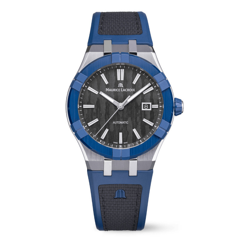Szwajcarski zegarek męski Maurice Lacroix Aikonic AC6008-SSL40-330-4. Model z mechanizmem automatycznym ML1000 z 60 godzinną rezerwą chodu. Koperta została wykonana ze szczotkowanej stali szlachetnej, natomiast niebieski bezel został wykonany z ceramiki. Czarno-grantowy pasek został wykonany z połączenia tworzywa sztucznego oraz włókien syntetycznych. Tarczę z włókna węglowego chroni najtwardsze, odporne na zarysowania szkło szafirowe z obustronną powłoką antyrefleksyjną. Średnica koperty wynosi 43mm natomiast grubość 11mm. Klasa wodoszczelności tego modelu wynosi 10ATM.