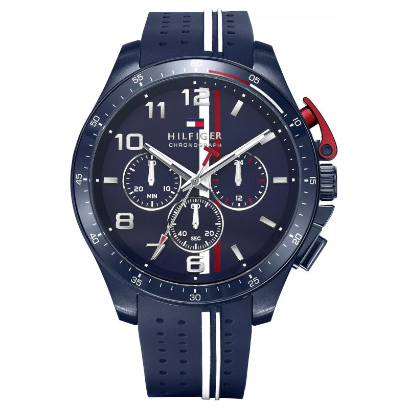 Modowy zegarek męski Tommy Hilfiger #Bank 1792169. Model z mechanizmem kwarcowym z komplikacją chronografu. Koperta została wykonana ze stali szlachetnej pokrytej powłoką w kolorze granatowym. Granatowy pasek został wykonany z silikonu. Granatową tarczę chroni szkło mineralne. Średnica koperty wynosi 46mm natomiast grubość 11mm. Klasa wodoszczelności tego modelu wynosi 5ATM.