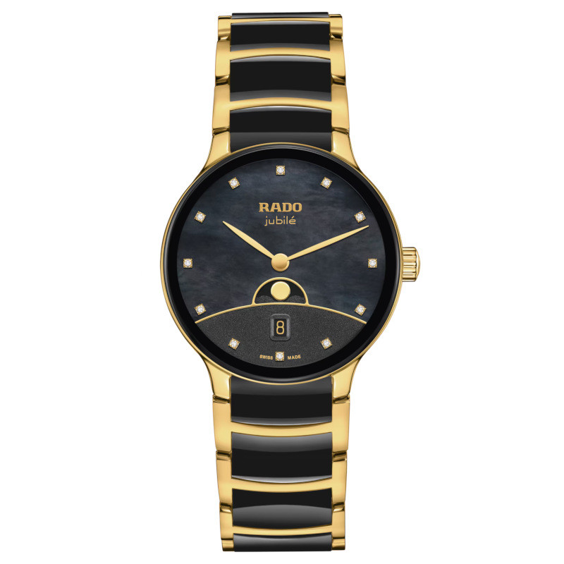 Zegarek Rado Centrix Moonphase to elegancki czasomierz, który oprócz odmierzania czasu pokazuje także fazy Księżyca. Model posiada zakrzywione szkło szafirowe z powłoką antyrefleksyjną oraz bransoletę z elementami wykonanymi z trwałej ceramiki high-tech. Tarcza z czarnej masy perłowej, ozdobiona metalowym symbolem Księżyca i 12 diamentami, nadaje zegarkowi luksusowy i artystyczny wygląd. Zegarek jest wygodny w noszeniu i bardzo trwały dzięki nowoczesnym materiałom stosowanym przez Rado. Precyzyjne działanie zapewnia kwarcowy mechanizm Rado R084 z datownikiem i wskaźnikiem fazy Księżyca.