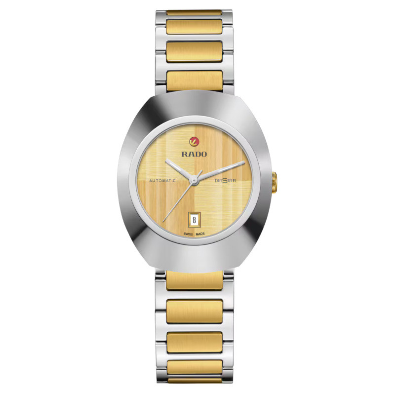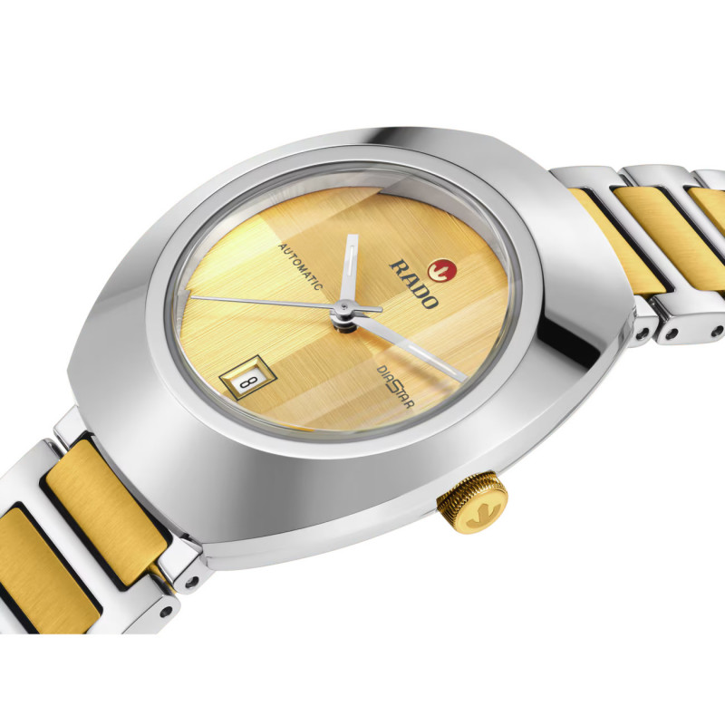 Szwajcarski elegancki zegarek męski RADO DiaStar Original Automatic R12170253. Model z mechanizmem automatycznym R586 z 48 godzinną rezerwą chodu oraz antymagnetyczna sprężyna włosową Nivachron™. Monochromatyczna koperta została wykonana ze stali szlachetnej połączonej z materiałem Ceramos. Bransoleta została wykonana z polerowanej stali szlachetnej częściowo pokrytej powłoką w kolorze złotym. Złotą, szczotkowaną w dwa kierunki tarczę chroni najtwardsze, odporne na zarysowania szkło szafirowe z fasetowaniem w kształcie równoległych pasków. Średnica koperty wynosi 30mm natomiast grubość 11mm. Klasa wodoszczelności tego modelu wynosi 10ATM.