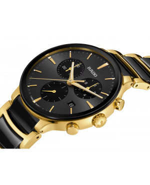 Szwajcarski elegancki zegarek męski RADO Centrix Chronograph R30211152. Model z precyzyjnym mechanizmem kwarcowym z komplikacją chronografu i datownikiem. Koperta wykonana ze stali szlachetnej. Bransoleta została wykonana z połączenia stali szlachetnej oraz czarnej ceramiki high-tech. Czarną tarczę chroni najtwardsze, odporne na zarysowania szkło szafirowe. Średnica koperty wynosi 41mm natomiast grubość 11,4mm. Klasa wodoszczelności tego modelu wynosi 5ATM.