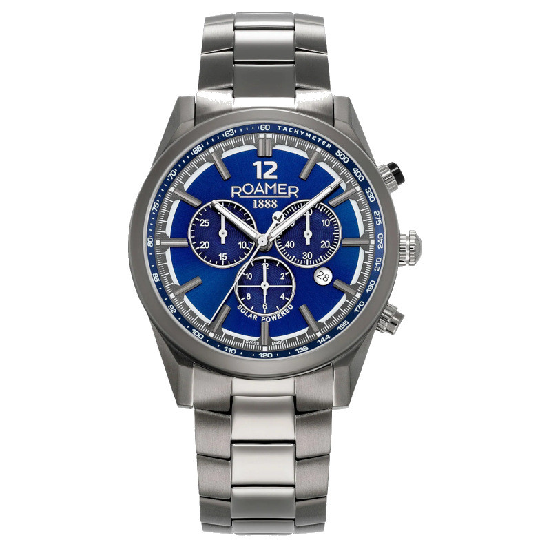 Roamer Helios Power to szwajcarski zegarek, który łączy nowoczesną technologię z ponadczasową elegancją. Jego 43-milimetrowa tytanowa koperta i bransoleta, wykończone powłoką jonową, zapewniają trwałość i stylowy wygląd.