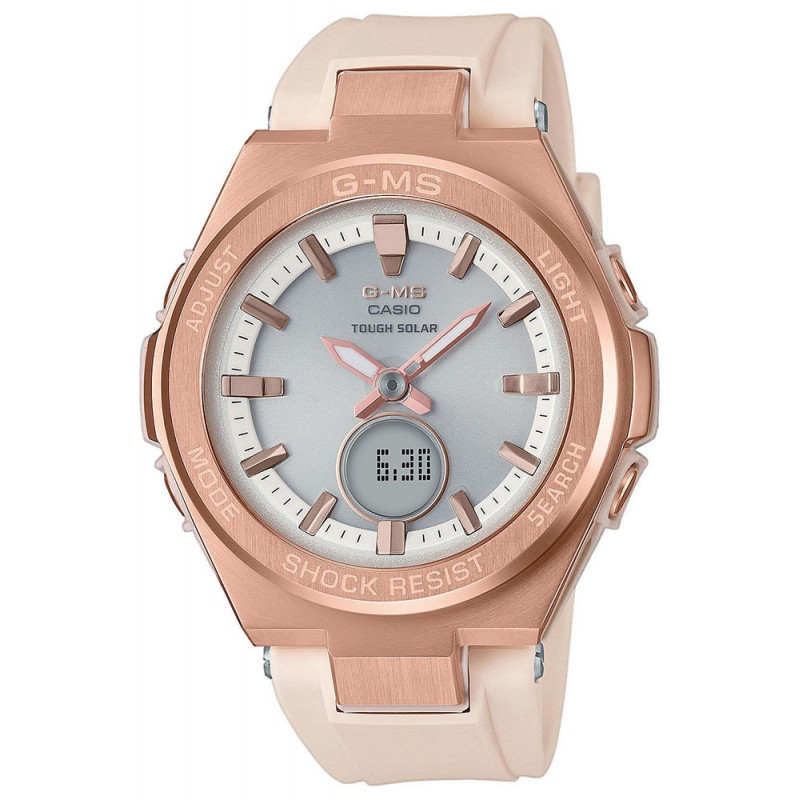 Zegarek damski Casio Baby-G G-MS METAL BEZEL MSG-S200G-4AER (MSGS200G4AER). Zegarek posiada wielofunkcyjny mechanizm kwarcowy zasilany światłem. Koperta została wykonana z tworzywa uretanowego i stali. Pasek silikonowy w kolorze różowym. Szkło mineralne. Średnica koperty wynosi 38 mm.