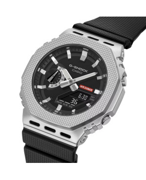 Sportowy zegarek męski Casio G-Shock Original Metal GM-2100M-1AER (GM2100M1AER). Zegarek posiada precyzyjny mechanizm kwarcowy wyposażony w funkcje datownika, stopera, timera i wskazań stref czasowych. Ma możliwość pracy w trybie 12 lub 24 h. Dodatkowo posiada kilka alarmów oraz podświetlenie, dzięki któremu widać doskonale co pokazuje wyświetlacz oraz wskazanie analogowe na tarczy zegarka. Koperta została wykonana z tworzywa sztucznego oraz stali szlachetnej. Pasek z tworzywa sztucznego. Utwardzane szkło mineralne. Szerokość koperty wynosi 44,4 mm. Zegarek jest odporny na wstrząsy i uderzenia, a wodoszczelność 200 metrów pozwala na pływanie i nurkowanie z zegarkiem na nadgarstku.