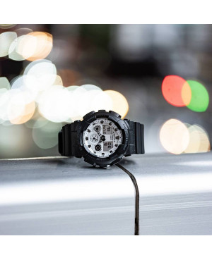 Sportowy zegarek męski CASIO G-Shock Original GA-100WD-1AER. Zegarek posiada precyzyjny, wielofunkcyjny mechanizm kwarcowy wyposażony w funkcję stopera, datownika, czasu światowego, stopera, timera, kliku alarmów oraz podświetlenia. Koperta oraz pasek zostały wykonane z tworzywa sztucznego. Utwardzane szkło mineralne. Szerokość koperty wynosi 51,2 mm. Zegarek jest odporny na wstrząsy i uderzenia, a wodoszczelność wynosząca 200 metrów pozwala na pływanie i nurkowanie z zegarkiem na nadgarstku.