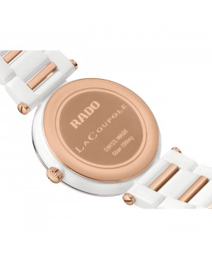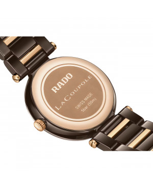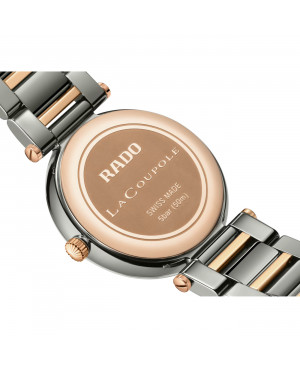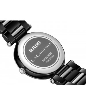 Szwajcarski elegancki zegarek damski Rado LaCoupole Diamonds R22243703. Model z precyzyjnym mechanizmem kwarcowym. Koperta została wykonana z ceramiki high-tech. Bransoleta została wykonana z połączenia stali szlachetnej z ceramiką. Czarną, ozdobnie giloszowaną tarczę z diamentami chroni najtwardsze, odporne na zarysowania szkło szafirowe. Średnica koperty wynosi 31mm natomiast grubość 8,4mm. Klasa wodoszczelności tego modelu wynosi 5ATM.