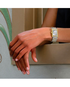 Szwajcarski klasyczny zegarek damski Maurice Lacroix Fiaba Square FA1205-PVY02-110-A. Model z precyzyjnym mechanizmem kwarcowym. Koperta została wykonana ze stali szlachetnej częściowo pokrytej powłoką w kolorze żółtego złota. Bransoleta została wykonana ze stali szlachetnej częściowo pokrytej powłoką w kolorze żółtego złota. Srebrną tarczę chroni najtwardsze, odporne na zarysowania szkło szafirowe. Szerokość koperty wynosi 34mm natomiast grubość 5,7mm. Klasa wodoszczelności tego modelu wynosi 5ATM.