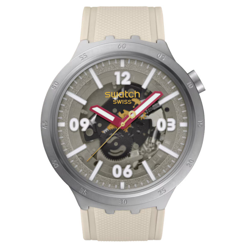 Modowy zegarek unisex Swatch Confident Moment SB07S125. Model z mechanizmem kwarcowym. Koperta została wykonana ze stali szlachetnej. Beżowy pasek został wykonany z silikonu. Transparentną tarczę chroni szkło hesalitowe Średnica koperty wynosi 47mm natomiast grubość 13,3mm. Klasa wodoszczelności tego modelu wynosi 3ATM.