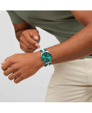 Szwajcarski modowy zegarek unisex Swatch Casual Stripe SS07S149. Model z mechanizmem kwarcowym. Koperta została wykonana ze stali szlachetnej. Pasek typu NATO został uszyty z włókien syntetycznych. Zieloną tarczę chroni szkło hesalitowe. Średnica koperty wynosi 42mm natomiast grubość 6,7mm. Klasa wodoszczelności tego modelu wynosi 3ATM.