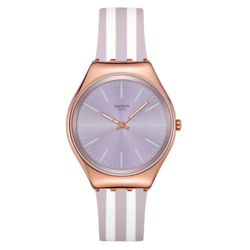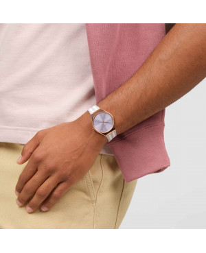 Szwajcarski modowy zegarek unisex Swatch Simply Beachy SYXG130. Model z mechanizmem kwarcowym. Koperta została wykonana ze stali szlachetnej pokrytej powłoką w kolorze różowego złota. Biało fioletowy pasek został wykonany z silikonu. Fioletową tarczę chroni szkło hesalitowe. Średnica koperty wynosi 38mm natomiast grubość 5,8mm. Klasa wodoszczelności tego modelu wynosi 3ATM.