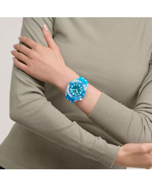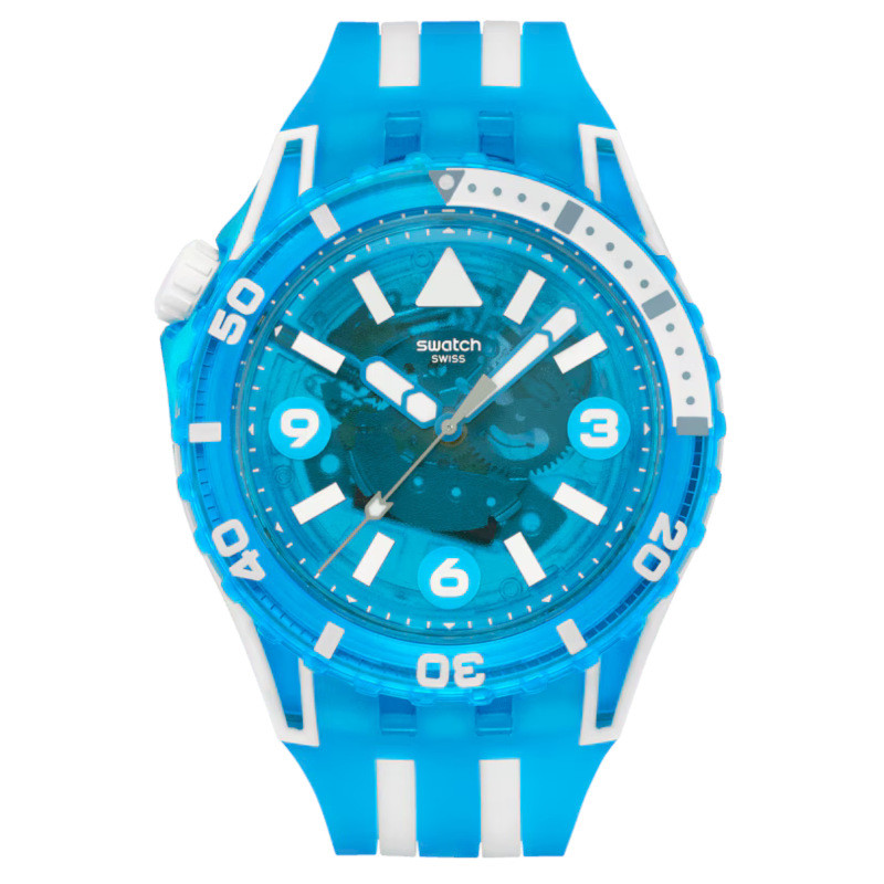 Zamień każdą chwilę w ekscytującą podwodną przygodę z zegarkami do nurkowania z kolekcji Swatch SCUBAQUA. Model BLUE FIRE łączy w sobie mistykę oceanicznych głębin i nowoczesny design. Przezroczysty niebieski materiał bio w połączeniu z matową bielą innowacyjnej Bioceramiki przywodzi na myśl hipnotyzujący blask bioluminescencyjnej meduzy. To idealny wybór dla tych, którzy pragną stylu i funkcjonalności podczas każdej morskiej wyprawy.