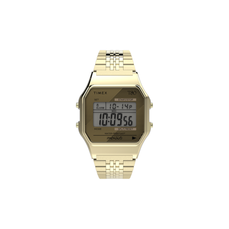 Elegancki zegarek damski Timex T80 TW2V21200. Model z mechanizmem kwarcowym. Koperta została wykonana z tworzywa sztucznego pokrytego powłoką w kolorze złotym. Bransoleta została wykonana ze stali szlachetnej pokrytej powłoką w kolorze złotym. Tarczę z wyświetlaczem chroni szkło hesalitowe. Szerokość koperty wynosi 34mm natomiast grubość 10mm. Klasa wodoszczelności tego modelu wynosi 3ATM.