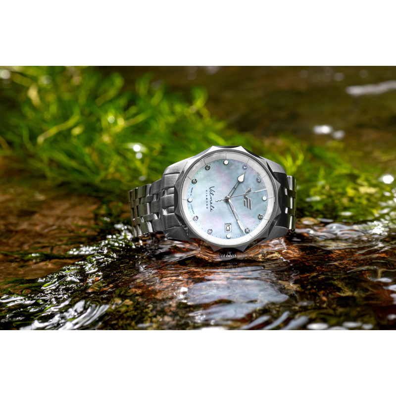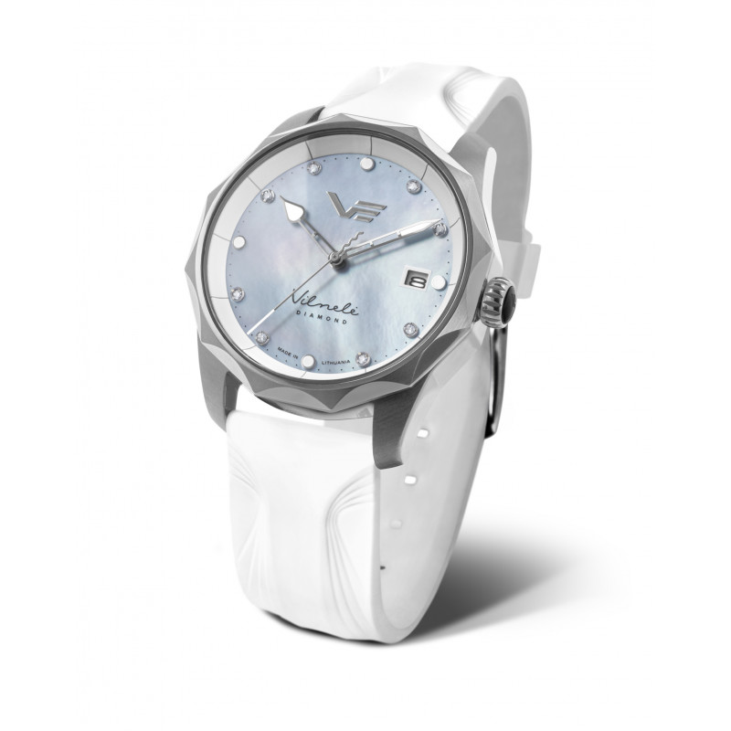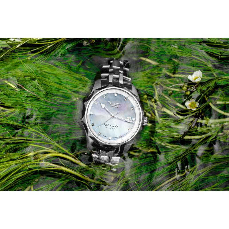 Zegarki Vilnelė to hołd dla naturalnego piękna i ruchu wody – charakteryzują się zakrzywionymi liniami kopert, falistymi lunetami i tarczami, które mienią się niczym powierzchnia rzeki odbijająca światło. Modele z chronografem podkreślają dynamikę poprzez głębokie, gradientowe tarcze, natomiast wersje solarne łączą masę perłową z diamentowymi detalami, nawiązując do harmonii i delikatności natury.