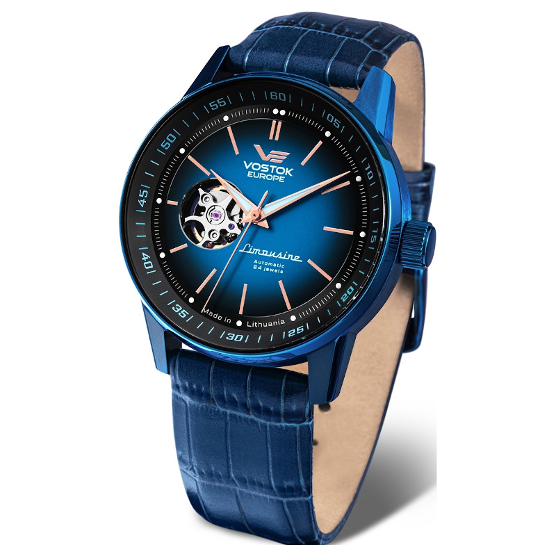 Elegancki zegarek męski VOSTOK EUROPE Limousine Gaz-14 NH38A/560D681. Model mechanizmem automatycznym z 42 godzinną rezerwą chodu. Koperta została wykonana ze stali szlachetnej pokrytej powłoką w kolorze niebieskim. Brązowy pasek został uszyty ze skóry naturalnej. Niebieską tarczę  typu open heart chroni szkło mineralne. Średnica koperty wynosi 43mm natomiast grubość 14mm. Klasa wodoszczelności tego modelu wynosi 5ATM. Zegarek pochodzi z kolekcji limitowanej do 3000 sztuk.